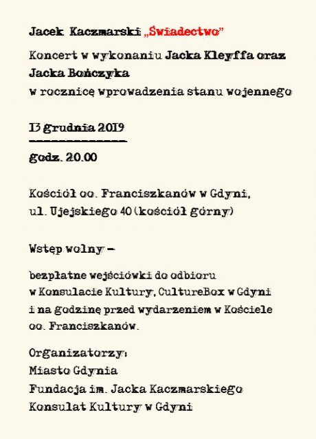 Jeden z ostatnich koncertów Jacka Kaczmarskiego odbył się 13 grudnia 2001 roku w Kościele oo. Franciszkanów w Gdyni. Zorganizowano go z myślą o upamiętnieniu 20. rocznicy wprowadzenia stanu wojennego w Polsce. Koncertem „Świadectwo” chcemy nawiązać do tamtego wydarzenia. W tym samym miejscu usłyszymy utwory z repertuaru Jacka Kaczmarskiego w interpretacji Jacka Bończyka - wielkiego admiratora Jacka K., świetnego śpiewającego aktora, reżysera, scenarzysty. Wykona on kilknaście znanych piosenek, m.in. Modlitwa o wschodzie słońca, Arka Noego, Nasza klasa, Starzy ludzie w autobusie, Przejście Polaków przez Morze Czerwone, Mury, Obława, Źródło, Prośba, Ilu nas w ciszy.