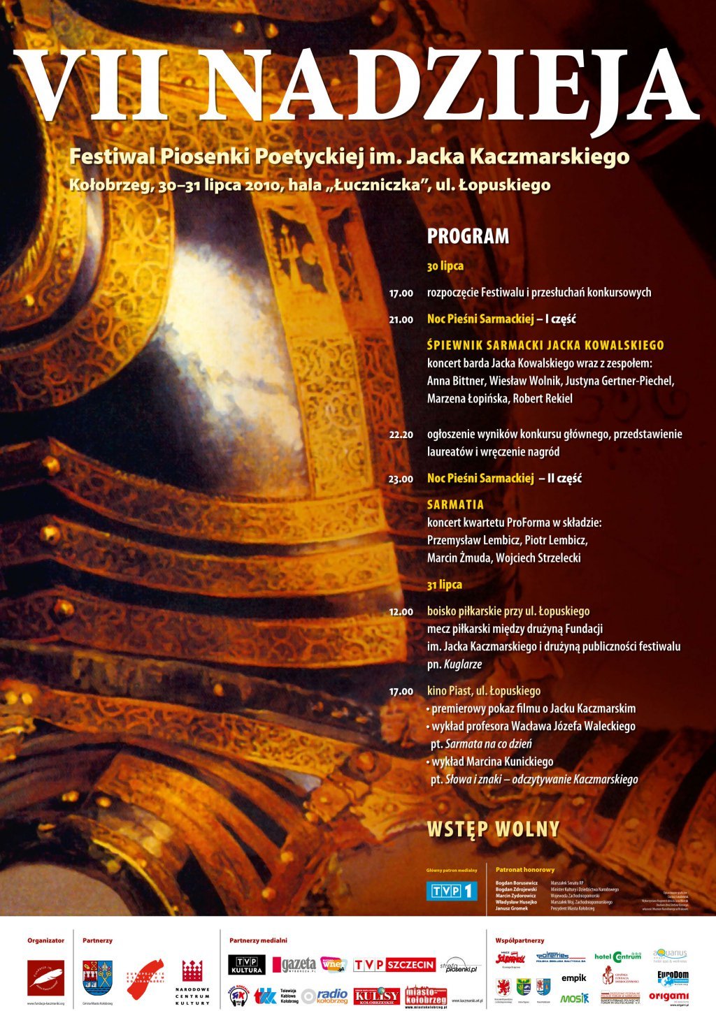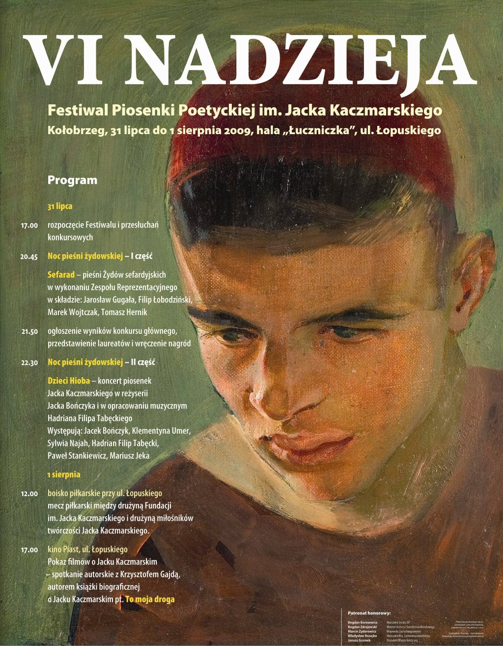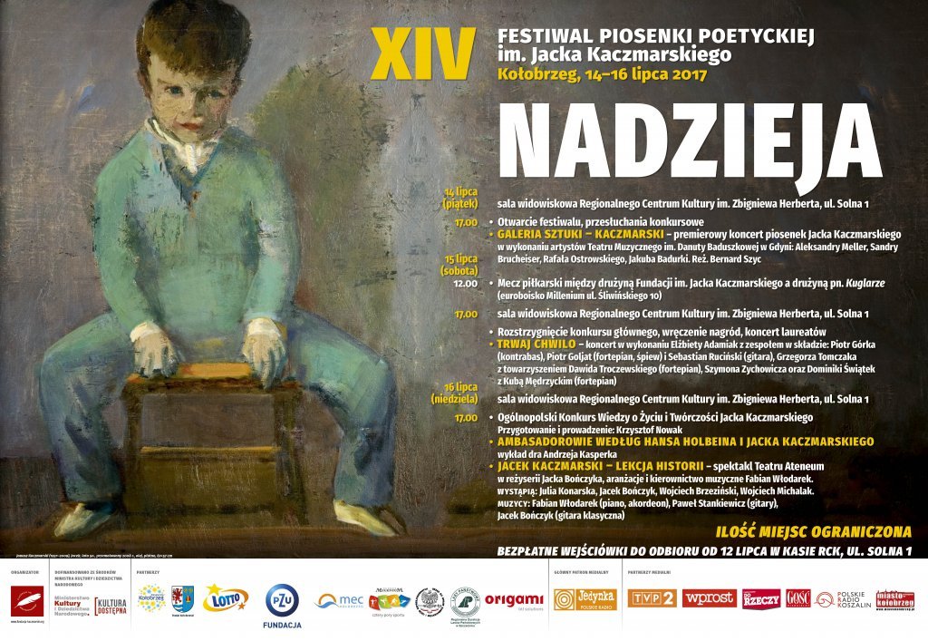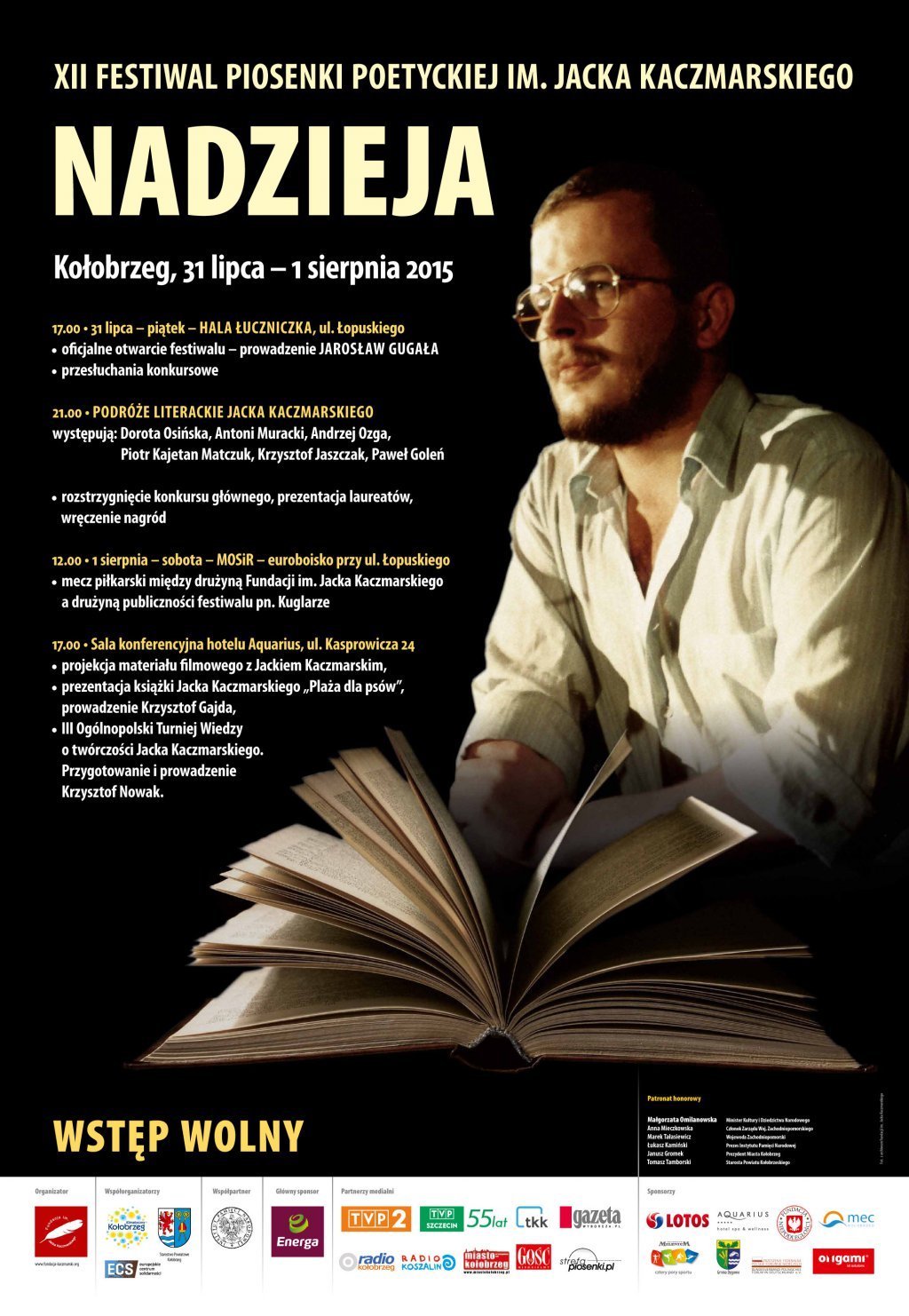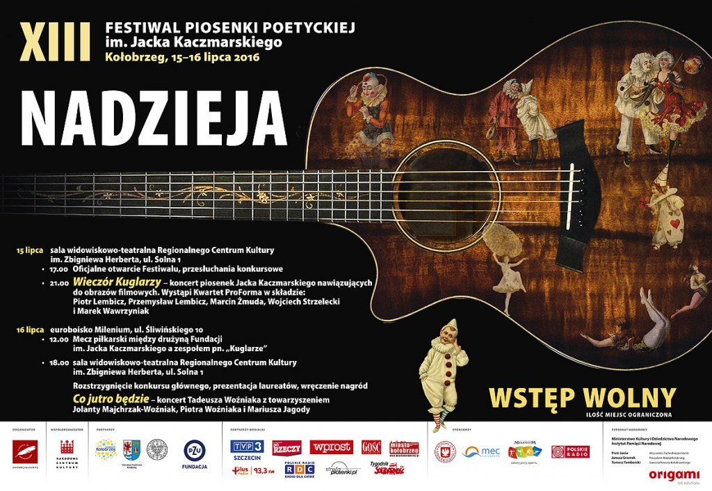 Imprezą towarzyszącą festiwalowi był mecz piłkarski, w którym zmierzyły się drużyny Fundacji im. Jacka Kaczmarskiego i Kuglarzy. Tym razem na kołobrzeskim euroboisku zwyciężyła drużyna Fundacji 3:2. Tradycyjnie odbyło się także nocne afterparty dla najbardziej wytrwałych wielbicieli twórczości artysty – piosenki patrona festiwalu śpiewano do czwartej nad ranem. Festiwal prowadził Robert Siwiec. Przypomnijmy, że organizator wydarzenia to Fundacja im. Jacka Kaczmarskiego. Główny Partner Festiwalu to PKN ORLEN, pozostali partnerzy: Gmina Miasto Kołobrzeg, Starostwo Powiatowe w Kołobrzegu, Fundacja PZU oraz Instytut Pamięci Narodowej, Miejska Energetyka Cieplna w Kołobrzegu, drukarnia Origami w Gdańsku oraz Miejski Ośrodek Sportu i Rekreacji w Kołobrzegu. Sponsor Festiwalu „Nadzieja” to Grupa ENERGA. Zadanie zostało dofinansowane ze środków Ministerstwa Kultury i Dziedzictwa Narodowego pochodzących z Funduszu Promocji Kultury w ramach programu „Kultura Dostępna”, Gminy Miasto Kołobrzeg, Powiatu Kołobrzeskiego, Fundacji PZU oraz dotacji Funduszu Popierania Twórczości Stowarzyszenia Autorów ZAiKS im. Andrzeja Szczypiorskiego. Główny patronat medialny – Polskie Radio. Patronaty medialne – TVP2, tygodniki: „Wprost”, „Gość Niedzielny” i „Do Rzeczy” oraz Polskie Radio Koszalin i portal internetowy miastokolobrzeg.pl. Patronat Honorowy nad XV edycją Festiwalu Piosenki Poetyckiej im. Jacka Kaczmarskiego „Nadzieja” objęli: wiceprezes Rady Ministrów, Minister Kultury i Dziedzictwa Narodowego prof. dr hab. Piotr Gliński, Prezes Instytutu Pamięci Narodowej dr Jarosław Szarek, Wojewoda Zachodniopomorski Tomasz Hinc, Prezydent Miasta Kołobrzeg Janusz Gromek oraz Starosta Kołobrzeski Tomasz Tamborski. Dziękujemy W ydawnictwu Prószyński i S-ka za ufundowanie nagród książkowych – Antologii poezji Jacka Kaczmarskiego „Między nami. W iersze zebrane”. Uczestnikom, sponsorom oraz osobom zaangażowanym w organizację Festiwalu składamy podziękowania za wszelką pomoc, a laureatom – serdeczne gratulacje i życzenia dalszych sukcesów!