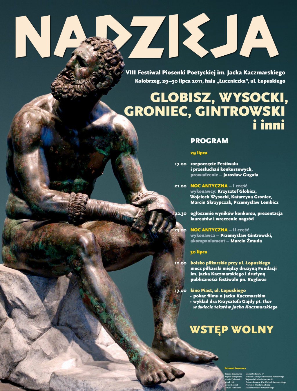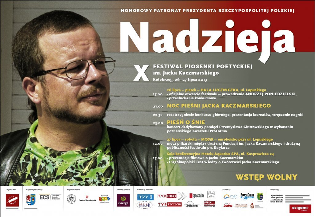 Imprezą towarzyszącą festiwalowi był mecz piłkarski, w którym zmierzyły się drużyny Fundacji im. Jacka Kaczmarskiego i Kuglarzy. Tym razem na kołobrzeskim euroboisku zwyciężyła drużyna Fundacji 3:2. Tradycyjnie odbyło się także nocne afterparty dla najbardziej wytrwałych wielbicieli twórczości artysty – piosenki patrona festiwalu śpiewano do czwartej nad ranem. Festiwal prowadził Robert Siwiec. Przypomnijmy, że organizator wydarzenia to Fundacja im. Jacka Kaczmarskiego. Główny Partner Festiwalu to PKN ORLEN, pozostali partnerzy: Gmina Miasto Kołobrzeg, Starostwo Powiatowe w Kołobrzegu, Fundacja PZU oraz Instytut Pamięci Narodowej, Miejska Energetyka Cieplna w Kołobrzegu, drukarnia Origami w Gdańsku oraz Miejski Ośrodek Sportu i Rekreacji w Kołobrzegu. Sponsor Festiwalu „Nadzieja” to Grupa ENERGA. Zadanie zostało dofinansowane ze środków Ministerstwa Kultury i Dziedzictwa Narodowego pochodzących z Funduszu Promocji Kultury w ramach programu „Kultura Dostępna”, Gminy Miasto Kołobrzeg, Powiatu Kołobrzeskiego, Fundacji PZU oraz dotacji Funduszu Popierania Twórczości Stowarzyszenia Autorów ZAiKS im. Andrzeja Szczypiorskiego. Główny patronat medialny – Polskie Radio. Patronaty medialne – TVP2, tygodniki: „Wprost”, „Gość Niedzielny” i „Do Rzeczy” oraz Polskie Radio Koszalin i portal internetowy miastokolobrzeg.pl. Patronat Honorowy nad XV edycją Festiwalu Piosenki Poetyckiej im. Jacka Kaczmarskiego „Nadzieja” objęli: wiceprezes Rady Ministrów, Minister Kultury i Dziedzictwa Narodowego prof. dr hab. Piotr Gliński, Prezes Instytutu Pamięci Narodowej dr Jarosław Szarek, Wojewoda Zachodniopomorski Tomasz Hinc, Prezydent Miasta Kołobrzeg Janusz Gromek oraz Starosta Kołobrzeski Tomasz Tamborski. Dziękujemy W ydawnictwu Prószyński i S-ka za ufundowanie nagród książkowych – Antologii poezji Jacka Kaczmarskiego „Między nami. W iersze zebrane”. Uczestnikom, sponsorom oraz osobom zaangażowanym w organizację Festiwalu składamy podziękowania za wszelką pomoc, a laureatom – serdeczne gratulacje i życzenia dalszych sukcesów!